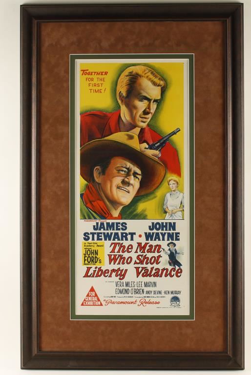 Theatre Lobby Display advertising the movie, "The Man Who Shot Liberty Valance". 1962 American Western-black and white film, was directed by John Ford, starring John Wayne and James Stewart. The supporting cast featured Lee Marvin, Vera Miles, Woody Strode, Edmond O'Brien, John Carradine, Andy Devine and Lee Van Cleef. This original color poster has been preserved on a canvas backing and custom framed. The color posters were special editions for the black and white movie issued by Paramount Studios. In 2007 this classic film was selected for preservation in the United States National Film Registry by the Library of Congress as being "Culturally, Historically, and Significant to the changing American Southwest Frontier".