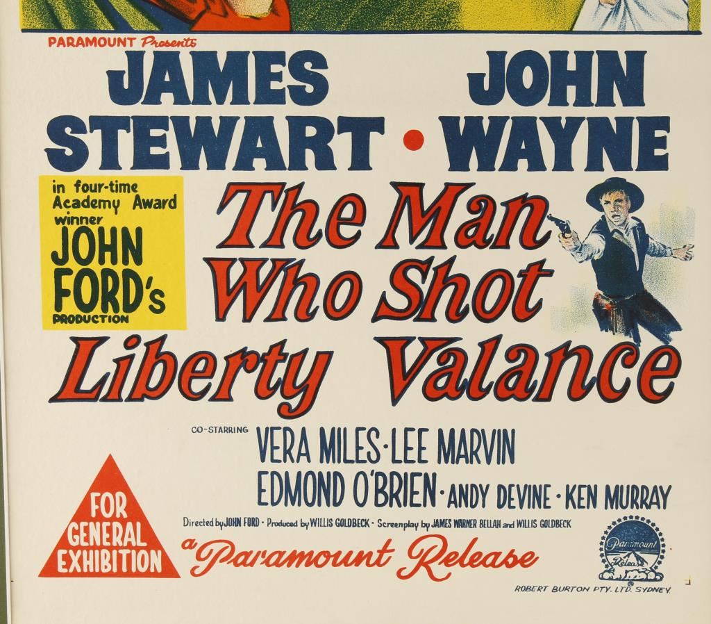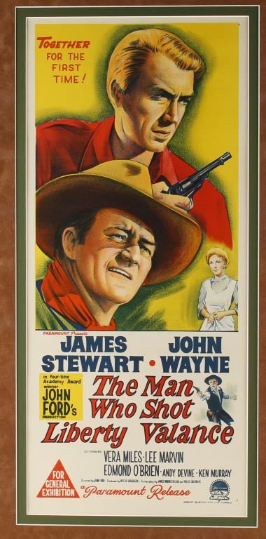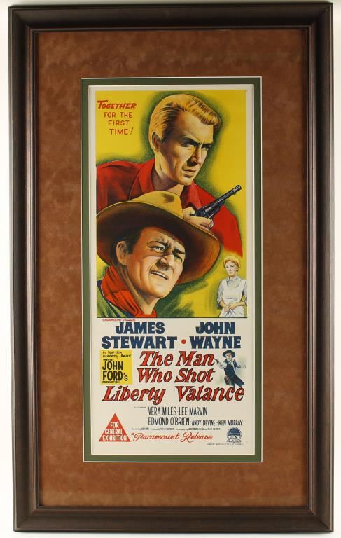 Theatre Lobby Display advertising the movie, "The Man Who Shot Liberty Valance". 1962 American Western-black and white film, was directed by John Ford, starring John Wayne and James Stewart. The supporting cast featured Lee Marvin, Vera Miles, Woody Strode, Edmond O'Brien, John Carradine, Andy Devine and Lee Van Cleef. This original color poster has been preserved on a canvas backing and custom framed. The color posters were special editions for the black and white movie issued by Paramount Studios. In 2007 this classic film was selected for preservation in the United States National Film Registry by the Library of Congress as being "Culturally, Historically, and Significant to the changing American Southwest Frontier".