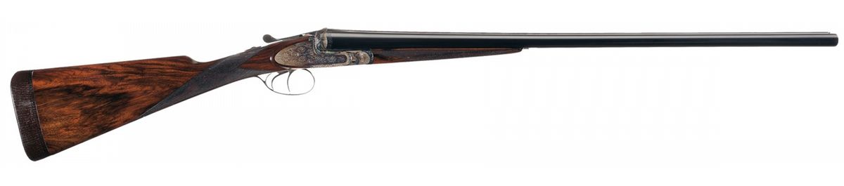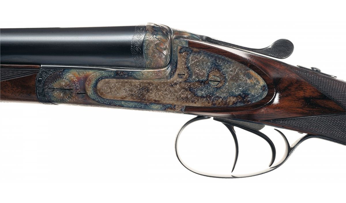 The side plates, receiver, break lever, safety and trigger guard have beautifully executed floral scroll engraving with several rose bouquets on the side plates and bottom of the receiver. Single brass bead sight, choked improved cylinder/modified and 3 inch chambers with ejectors. The top of the right barrel is marked "A. FORGERON" with the top of the left barrel marked "LIEGE". Mounted on a nice straight grain walnut forearm with multi-point checkering and a straight grip walnut stock with a silver initial oval and leather covered recoil pad. Length of pull is 13 3/8 inches.