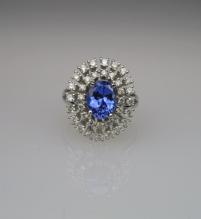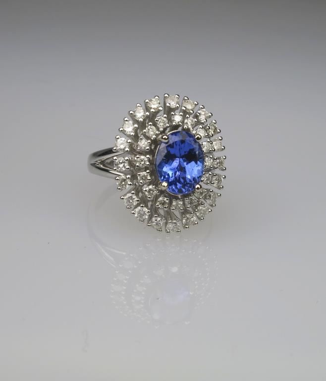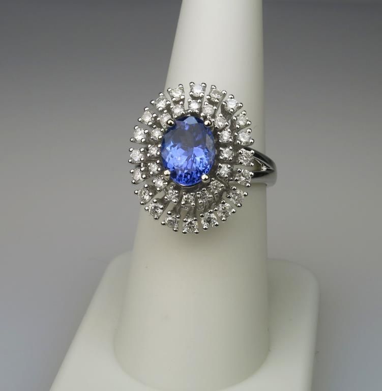 Fantastic Fine Tanzanite and Diamond Ring with 2.09 carat oval Tanzanite and 36 round cut Diamonds weighing approx. 1.50 carats with F-G colors set in a beautiful double halo style setting in 14 kt. white gold. Retail$4,000-$6,000. Estimate $2,500-3,000.