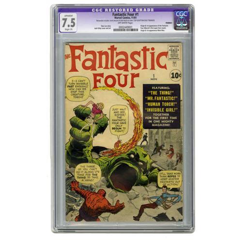 <B>Fantastic Four #1 (Marvel, 1961) CGC Apparent VF- 7.5 Slight (P) Off-white pages.</B></I> Marvel's first family of superheroes got their start in this historic first issue. It's here where we meet Reed Richards (Mr. Fantastic), Sue Storm (Invisible Girl), Johnny Storm (The Human Torch), and Ben Grimm (The Thing). Also look for the origin and first appearance of their longtime nemesis, the Mole Man. Jack Kirby provided the now classic cover and interior art, and Stan "The Man" Lee wrote the story. CGC notes, "Restoration includes: small amount of color touch on cover. (Top & bottom edge trimmed)" Overstreet 2005 GD 2.0 value = $875; VG 4.0 value = $1,750; FN 6.0 value = $2,625; VF 8.0 value = $9,200.