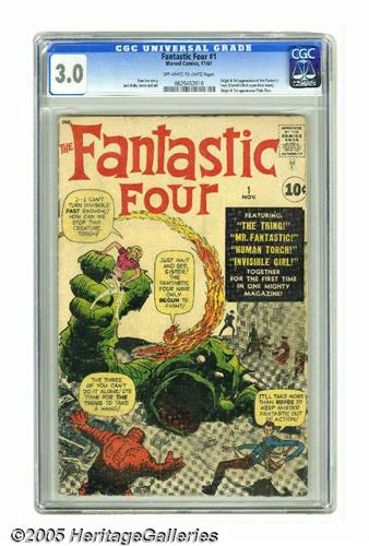 <B>Fantastic Four #1 (Marvel, 1961) CGC GD/VG 3.0 Off-white to white pages.</B></I> With the "Fantastic Four" movie currently scheduled to hit screens on July 8, now's the time to grab a copy of the group's first appearance, with story by Stan Lee and art by Jack Kirby. It's the third most-valuable comic of the Silver Age according to Overstreet. Overstreet 2005 GD 2.0 value = $875; VG 4.0 value = $1,750. CGC census 3/05: 26 in 3.0, 154 higher. <I>From the collection of Chris Bell.</B></I>