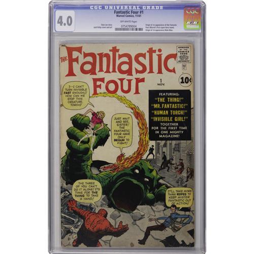 <B>Fantastic Four #1 (Marvel, 1961) CGC VG 4.0 Off-white pages.</B></I> This is the first appearance of the Fantastic Four and the very first Silver Age Marvel comic! The team of writer Stan Lee and artist Jack Kirby produced an unforgettable gem of comicdom here. Also making his first appearance was the villainous Mole Man. The bidding on this <I>fantastic</B></I> single owner copy should be feverish! Overstreet 2006 VG 4.0 value = $1,900. CGC census 9/06: 46 in 4.0, 136 higher. <I>From the Madison Monk Collection.</B></I><BR><BR><b>Shipping:</b> Slabbed Comic (<a target="_blank" href="http://www.heritageauctions.com/common/shipping.php">view shipping information</a>)