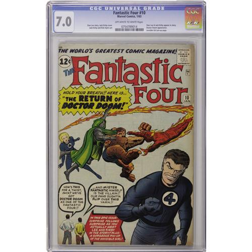 <B>Fantastic Four #10 (Marvel, 1963) CGC FN/VF 7.0 Off-white to white pages.</B></I> The metallic menace Doctor Doom makes a cover appearance and Stan Lee and Jack Kirby also appear as characters on the cover and in the story. Kirby takes on the cover and interior art chores on this issue. Overstreet 2006 FN 6.0 value = $315; VF 8.0 value = $893. CGC census 9/06: 16 in 7.0, 64 higher. <I>From the Madison Monk Collection.</B></I><BR><BR><b>Shipping:</b> Slabbed Comic (<a target="_blank" href="http://www.heritageauctions.com/common/shipping.php">view shipping information</a>)