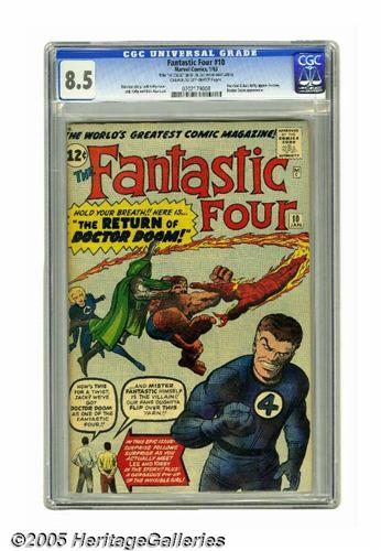 <B>Fantastic Four #10 (Marvel, 1963) CGC VF+ 8.5 Cream to off-white pages.</B></I> Why does Reed Richards look so evil on this Jack Kirby cover? Because he's switched bodies with Doctor Doom! And in what may be a first for any comic magazine, the issue's artist and writer (namely Kirby and Stan Lee) are shown on the cover. Stan and Jack appear in the story as well. Overstreet 2005 VF 8.0 value = $876; VF/NM 9.0 value = $1,413. CGC census 6/05: 12 in 8.5, 22 higher. <I>From the collection of Joe and Nadia Mannarino.</B></I>