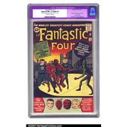 Fantastic Four #11 (Marvel, 1963) CGC Apparent NM- 9.2 Slight (A) Off-white to white pages. The Impossible Man shows up for his origin and first appearance to bedevil our fabulous foursome in this four-color classic from the "House of Ideas." Unfortunately, a small amount of amateur color touch (filling in a couple of spine cracks) earns this a purple label, but it comes by its 9.2 grade honestly, and is still a fabulous example of this early issue, with its vivid, subtle colors intact, razor-sharp corners, and fresh, crisp appearance. Overstreet 2002 VF 8.0 value = $478; NM 9.4 value = $900. Important notice: We expect to be auctioning lots at the rate of 200-250 per hour. Sometimes eBay Premier live bid software cannot keep up with that pace, so we strongly recommend that you place a realistic proxy bid now as insurance to avoid disappointment. Also please note that all Heritage/CAA lots purchased through eBay Premier carry a 20% Buyer's Premium. Please make sure you read the Terms and Conditions.