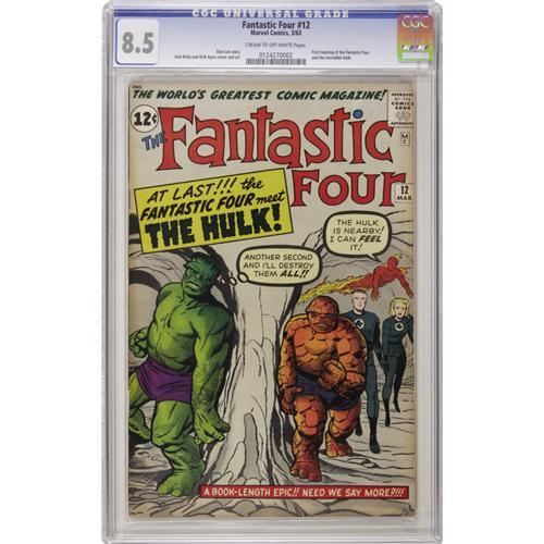 <B>Fantastic Four #12 (Marvel, 1963) CGC VF+ 8.5 Cream to off-white pages.</B></I> Over the years this issue's value has appreciated to the point that only issues #1-5 of the title have higher Overstreet values. The reason? Marvel readers love blockbuster fights! The FF run into the Hulk for the first time here, and the sparks fly! The crossover is tied with <B>Amazing Spider-Man</B></I> #1 as the first Marvel crossover. Jack Kirby does the cover and story art honors. Overstreet 2006 VF 8.0 value = $1,768; VF/NM 9.0 value = $3,009. CGC census 9/06: 12 in 8.5, 21 higher.<BR><BR><b>Shipping:</b> Slabbed Comic (<a target="_blank" href="http://www.heritageauctions.com/common/shipping.php">view shipping information</a>)