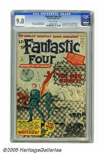 <B>Fantastic Four #13 (Marvel, 1963) CGC VF/NM 9.0 Off-white pages.</B></I> Another brilliant Stan Lee/Jack Kirby creation, the Watcher, made his first appearance in this issue. Both that character and the Blue Area of the Moon where he lives, also seen for the first time here, would become quite important in the Marvel Universe in years to come. Also appearing for the first time are the Red Ghost and his Super-Apes, and to really make things interesting, none other than Steve Ditko inked Kirby's pencils on the issue. When this lot comes up for auction, make sure you're a bidder, not a Watcher! Overstreet 2005 VF/NM 9.0 value = $688; NM- 9.2 value = $950. CGC census 6/05: 8 in 9.0, 5 higher.
