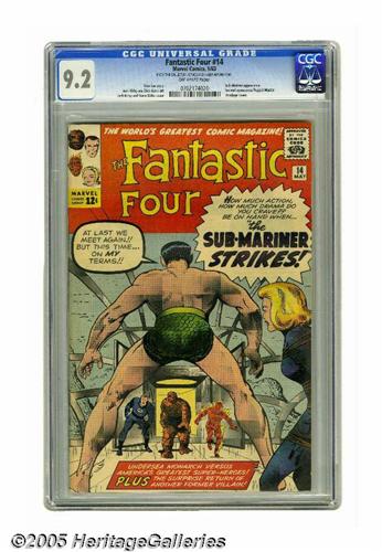 <B>Fantastic Four #14 (Marvel, 1963) CGC NM- 9.2 Off-white pages.</B></I> The Sub-Mariner's back for another tussle with the Fantastic Four, and the group has to take on the Puppet Master as well. The cover, showing the Invisible Girl in bondage, was penciled by Jack Kirby and inked by Steve Ditko. The story art is also by Kirby. Overstreet 2005 NM- 9.2 value = $725. CGC census 6/05: 5 in 9.2, 13 higher.