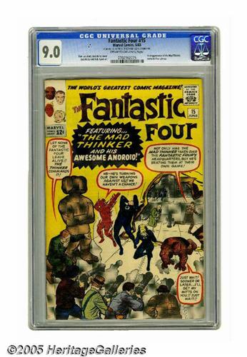 <B>Fantastic Four #15 (Marvel, 1963) CGC VF/NM 9.0 Cream to off-white pages.</B></I> The Mad Thinker made his first appearance here. The villain (who calls himself the Thinker, with the rest of the world supplying the "Mad" part) creates his Awesome Android by stealing Reed Richards' research. The issue's cover and art are by Jack Kirby. Overstreet 2005 VF/NM 9.0 value = $535; NM- 9.2 value = $725. CGC census 6/05: 5 in 9.0, 9 higher. <I>From the collection of Joe and Nadia Mannarino.</B></I>