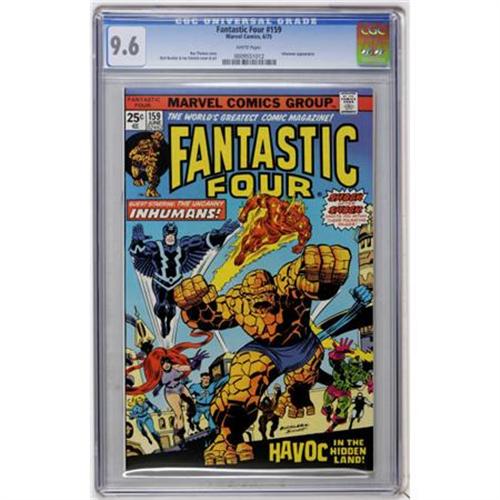 <B>Fantastic Four #159 (Marvel, 1975) CGC NM+ 9.6 White pages.</B></I> Inhumans appearance. Rich Buckler cover and art. Overstreet 2007 NM- 9.2 value = $16. CGC census 9/07: 9 in 9.6, 3 higher. <I> From the Janowicz Collection.</B></I><BR><BR><b>Shipping:</b> Comics - Slabbed (certified) (<a target="_blank" href="http://www.heritageauctions.com/common/shipping.php">view shipping information</a>)
