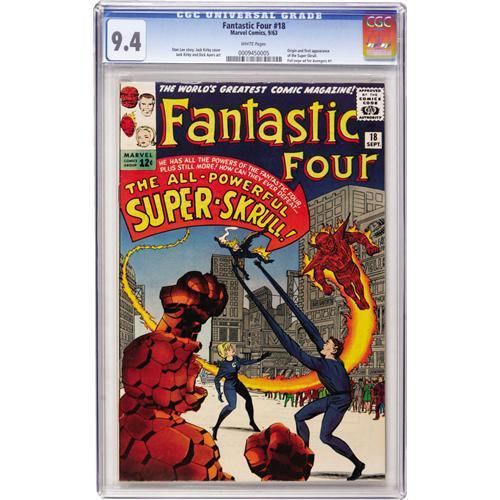 <B>Fantastic Four #18 (Marvel, 1963) CGC NM 9.4 White pages.</B></I> This should be one of the most hotly contested copies of this FF run, as this book's almost impossible to find in the highest grades -- this is one of only two copies to crack the 9.2 barrier. It's the origin and first appearance of the Super-Skrull, drawn by Jack Kirby. Overstreet 2006 NM- 9.2 value = $785. CGC census 3/07: 1 in 9.4, 1 higher. <I> From the Janowicz Collection.</B></I><BR><BR><b>Shipping:</b> Comics - Slabbed (certified) (<a target="_blank" href="http://www.heritageauctions.com/common/shipping.php">view shipping information</a>)