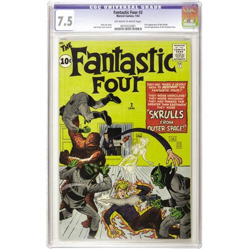 <B>Fantastic Four #2 (Marvel, 1962) CGC VF- 7.5 Off-white to white pages.</B></I> The eye appeal of this copy suggests a higher grade, and one has to look closely to find the minor stress and wear signs that keep this pretty book just below high-grade status. The second appearance of the Fantastic Four is also occasioned by the first appearance of the Skrulls. We see this issue less often than #1. Jack Kirby provided the cover and story art. Overstreet 2006 VF 8.0 value = $3,065. CGC census 9/06: 8 in 7.5, 36 higher.<BR><BR><b>Shipping:</b> Slabbed Comic (<a target="_blank" href="http://www.heritageauctions.com/common/shipping.php">view shipping information</a>)