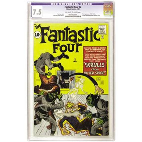 We see this issue less often than #1 -- it's the second appearance of the FF and the first appearance of the Skrulls. Jack Kirby provided the cover and story art. Overstreet 2006 VF 8.0 value = $3,065. CGC census 9/06: 8 in 7.5, 36 higher.<BR><BR><b>Shipping:</b> Slabbed Comic (<a target="_blank" href="http://www.heritageauctions.com/common/shipping.php">view shipping information</a>)
