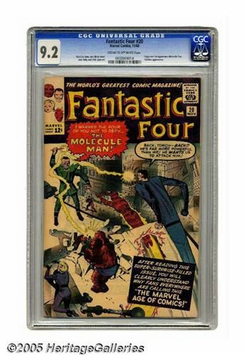 <B>Fantastic Four #20 (Marvel, 1963) CGC NM- 9.2 Cream to off-white pages.</B></I> This was the first appearance of the Molecule Man, one of the most powerful villains in the Marvel Universe. Stan Lee and Jack Kirby's creation made a big comeback in the 1980s to figure prominently in the <B>Secret Wars</B></I> series. This issue's cover and interior art are by Kirby.Overstreet 2005 NM- 9.2 value = $750. CGC census 3/05: 2 in 9.2, 9 higher.