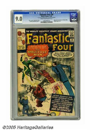 <B>Fantastic Four #20 (Marvel, 1963) CGC VF/NM 9.0 Cream to off-white pages.</B></I> The Molecule Man was one of the most powerful villains in the Marvel Universe, and this issue has his origin and first appearance. The issue's cover and art are by Jack Kirby. Overstreet 2005 VF/NM 9.0 value = $551; NM- 9.2 value = $750. CGC census 6/05: 10 in 9.0, 11 higher. <I>From the collection of Joe and Nadia Mannarino.</B></I>