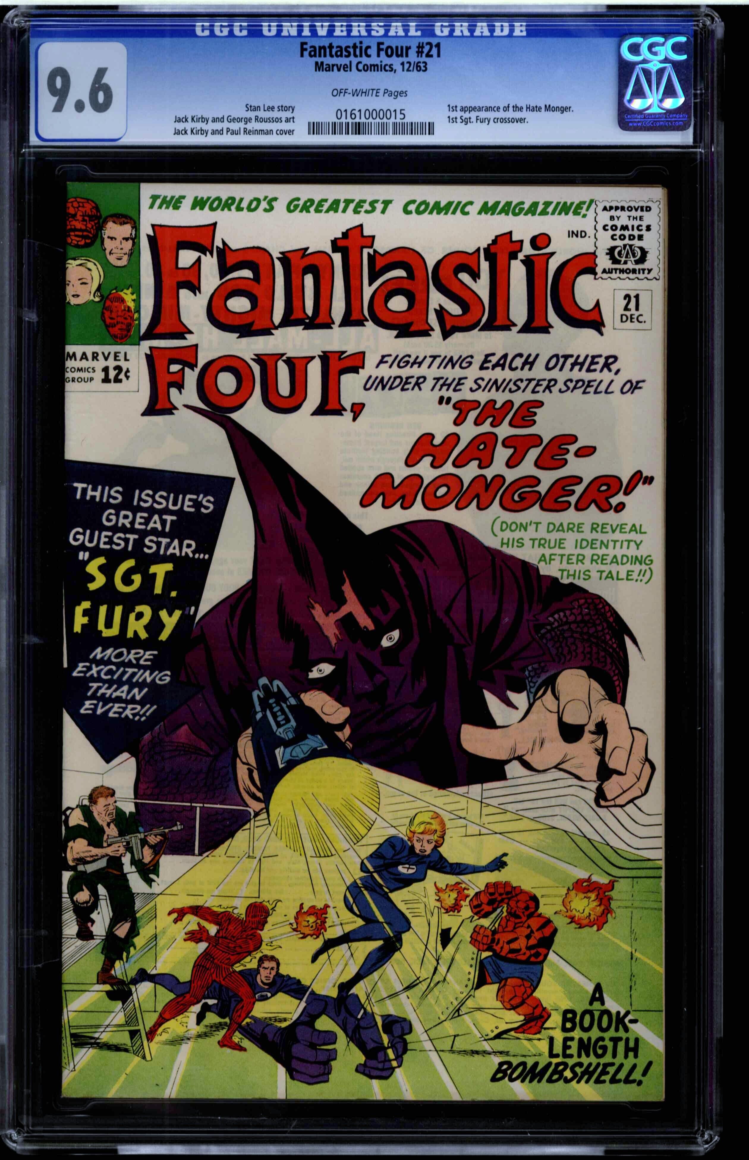 Fantastic Four #21 CGC 9.6 off-white pages. Stan Lee story, Jack Kirby and George Roussos art. Jack Kirby and Paul Reinman cover. 1st appearance of the Hate Monger, 1st Sgt Fury crossover. Overstreet 2009 NM 9.2 value = $950. The CGC universal census reports 3 at 9.6 and 1 better. Your chance to buy one the 5 best copies of this book.