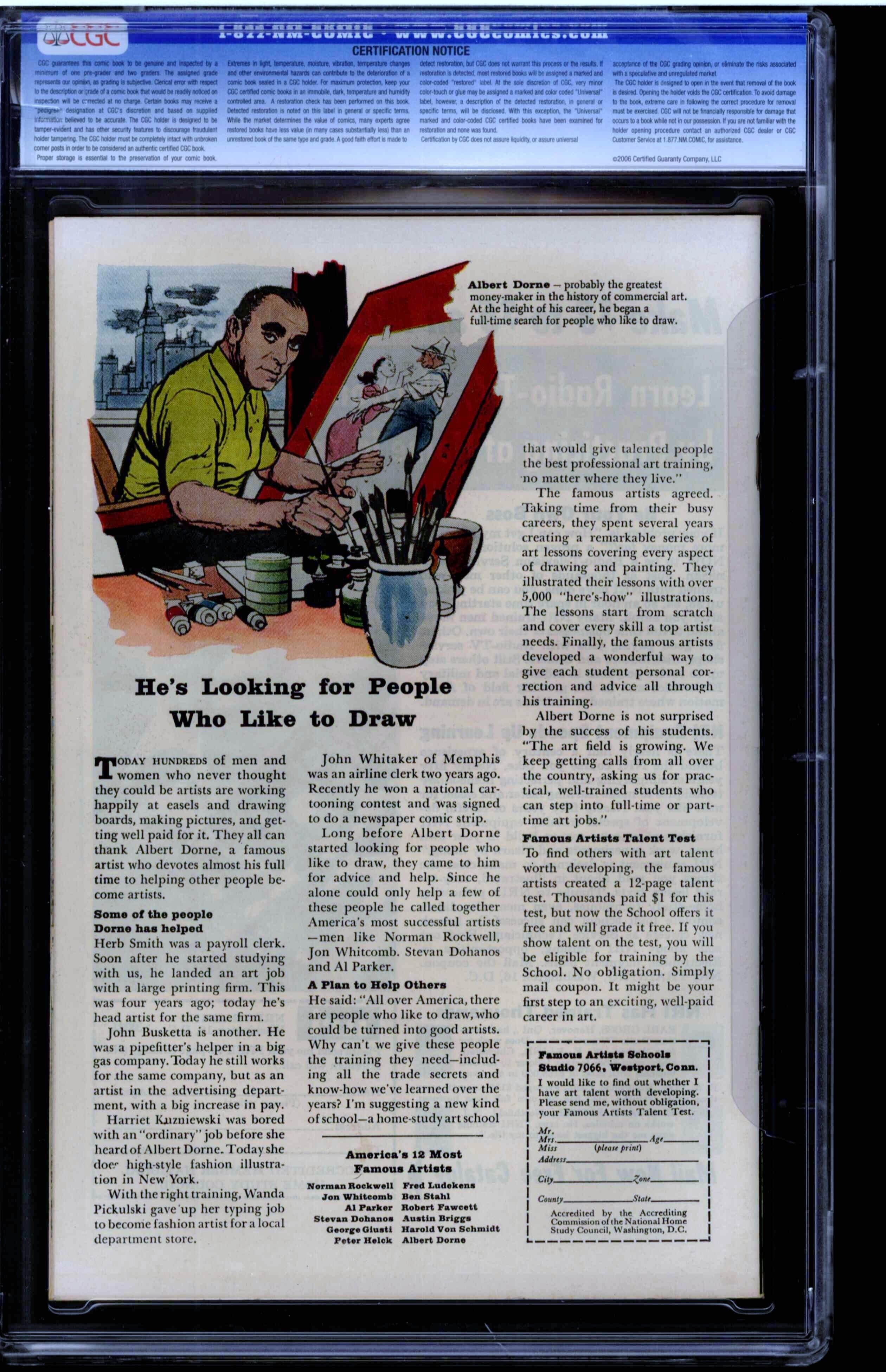 The Auctioneer has reserved the right to reject any and all bids, and to bid at the auction. Auctioneers Auctions are not on approval. Auctioneer does not allow certified material to be returned because of possible differences of opinion with respect to the grade offered by any third party organization, dealer, or service. Absolutely no guarantee of grade is offered for un-certified property sold and subsequently submitted to a third-party grading service. There will be no exceptions to this policy. Under extremely limited circumstances, (e.g. gross cataloging error) a purchaser, who did not bid from the floor, may request Auctioneer to evaluate voiding a sale; such request must be made in writing detailing the alleged gross error, and submission of the lot to the Auctioneer must be pre-approved by the Auctioneer. Bidder must notify Auctioneer in writing of such request within three (3) days of the non-floor bidder receipt of the lot. Any lot that is to be evaluated must be in our offices within 30 days after Auction. Grading does not qualify for this evaluation process nor do such complaints constitute a basis to challenge the authenticity of a lot. AFTER THAT 30-DAY PERIOD, NO LOTS MAY BE RETURNED FOR REASONS OTHER THAN AUTHENTICITY. Lots returned must be housed intact in the original holder. No lots purchased by floor Bidders may be returned (including those Bidders acting as agents for others). Late remittance for purchases may be considered just cause to revoke all return privileges. B: Auctions conducted solely on the Internet have a THREE (3) DAY RETURN POLICY: Lots paid for within seven days of the Auction closing are sold with a three (3) day return privilege. You may return lots under the following conditions: Within three days of receipt of the lot, you must first notify Auctioneer by contacting Client Service by phone (314-680-8599) or e-mail (moundcityauctions@gmail.com), and immediately mail the lot(s) fully insured to the attention of Returns, Mound City Auctions 1081 Teson Rd. Hazelwood, MO. 63042. Lots must be housed intact in their original holder and in their original condition. You are responsible for the insured, safe delivery of any lots. Auctioneer will not be responsible for lots returned in non-registered mail or lots returned without prior authorization per section B. A non-negotiable return fee of 5% of the purchase price ($10 per lot minimum) will be deducted from the refund for each returned lot or billed directly. Postage and handling fees are not refunded. After the three-day period (from receipt), no items may be returned for any reason. Late remittance for purchases revokes all Return-Restock privileges. C: Bidders who have inspected the lots prior to the auction will not be granted any return privileges. D: Comic books sold referencing a third-party grading service are sold “as is” without any express or implied warranty. Certain warranties may be available from the grading services and the Bidder is referred to them for further details: Certified Guaranty Company, LLC. (CGC), P.O. Box 4738, Sarasota, FL 34230. E: Bidders who intend to challenge authenticity or provenance of a lot must notify Auctioneer in writing within thirty (30) days of the Auctions conclusion. In the event Auctioneer cannot deliver the lot or subsequently it is established that the lot lacks title, provenance, authenticity, or other transfer or condition issue is claimed, Auctioneer's liability shall be limited to rescission of sale and refund of purchase price; in no case shall Auctioneer's maximum liability exceed the high bid on that lot, which bid shall be deemed for all purposes the value of the lot. After one year has elapsed, Auctioneer's maximum liability shall be limited to any commissions and fees Auctioneer earned on that lot. F: All comics are guaranteed genuine, but are not guaranteed as to grade, since grading is a matter of opinion, an art and not a science, and therefore the opinion rendered by the Auctioneer or any third party grading service may not agree with the opinion of others (including trained experts), and the same expert may not grade the same item with the same grade at two different times. G: Since we cannot examine encapsulated comics, they are sold “as is”without our grading opinion, and may not be returned for any reason. Auctioneer shall not be liable for any patent or latent defect or controversy pertaining to or arising from any encapsulated collectible. In any such instance, purchaser's remedy, if any, shall be solely against the service certifying the collectible. H: Due to changing grading standards over time, differing interpretations, and to possible mishandling of items by subsequent owners, Auctioneer reserves the right to grade items differently than shown on certificates from any grading service that accompany the items. Auctioneer also reserves the right to grade items differently than the grades shown in the prior catalog should such items be reconsigned to any future auction. I: Although consensus grading is employed by most grading services, it should be noted as aforesaid that grading is not an exact science. In fact, it is entirely possible that if a lot is broken out of a plastic holder and resubmitted to another grading service or even to the same service, the lot could come back with a different grade assigned. J: Certification does not guarantee protection against the normal risks associated with potentially volatile markets. The degree of liquidity for certified collectibles will vary according to general market conditions and the particular lot involved. For some lots there may be no active market at all at certain points in time."