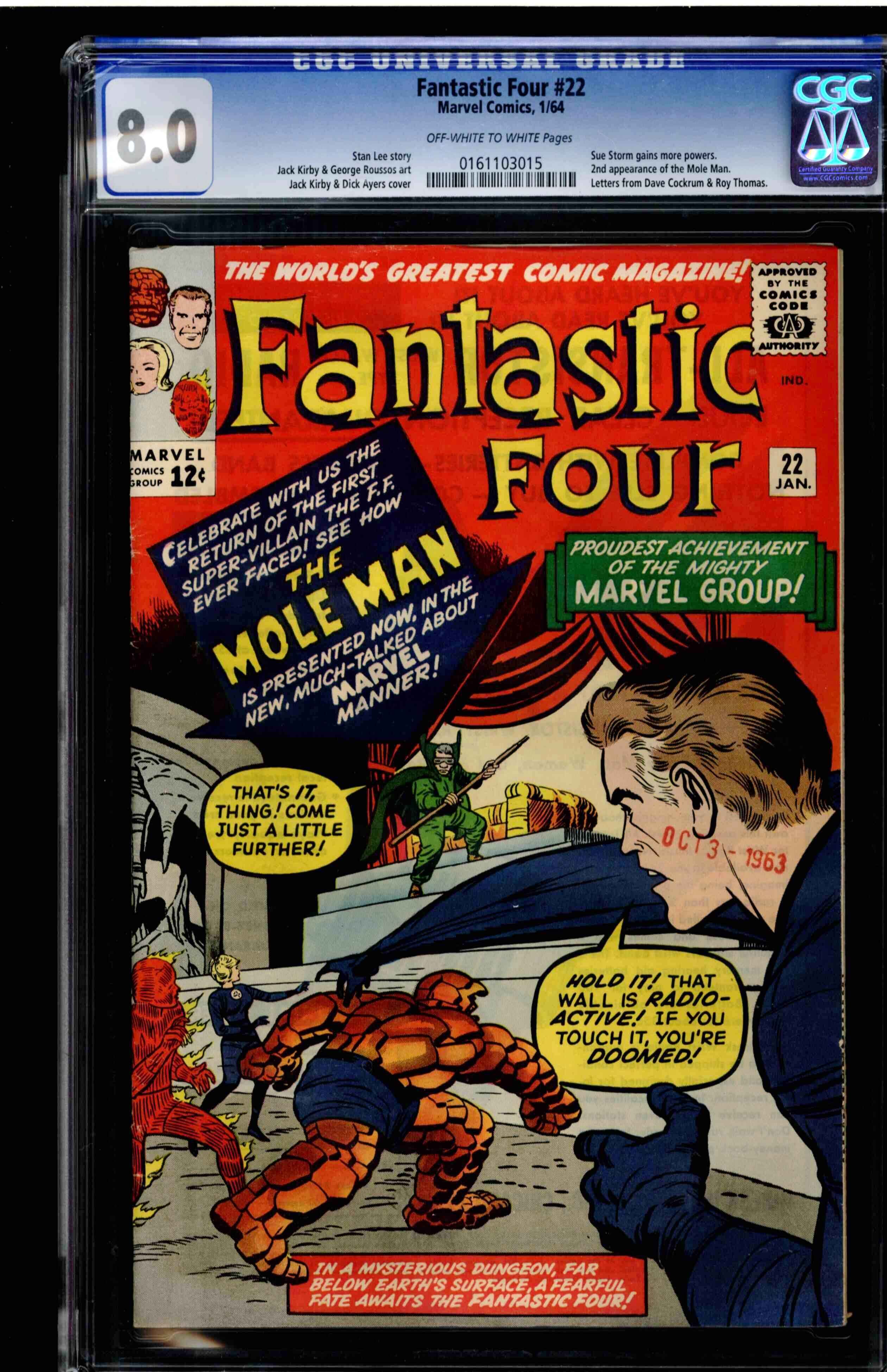Fantastic Four #22 CGC 8.0 off-white to white pages. Stan Lee story. Jack Kirby and George Roussos art. Jack Kirby & Dick Ayers cover. Sue Storm gains more powers. 2nd appearance of the Mole Man. Letters from Dave Cockrum and Roy Thomas. Overstreet 2009 VF 8.0 value = $222. CGC census: 21 in 8.0, 54 higher.