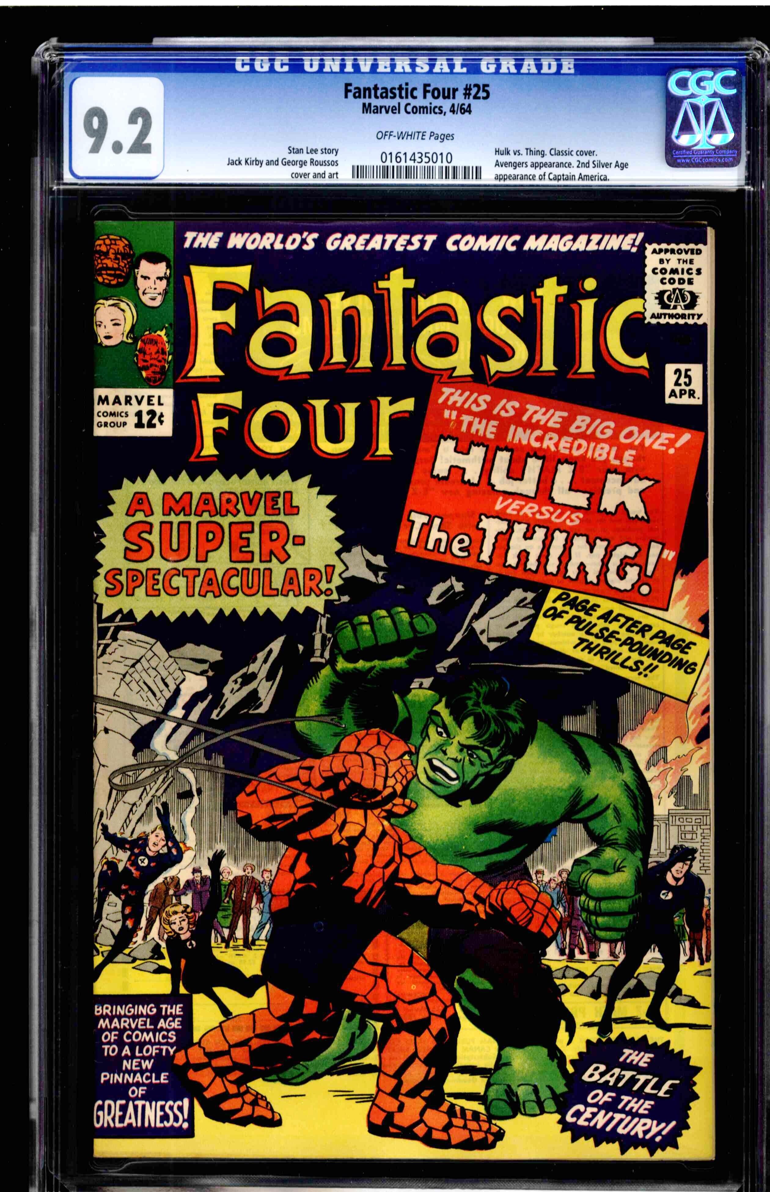 Fantastic Four #25 CGC 9.2 off-white pages. Stan Lee story. Jack Kirby and George Roussos cover and art. Hulk vs. Thing. Classic cover. Avengers appearance. 2nd Silver Age appearance of Captain America. Overstreet 2009 NM 9.2 value = $1,300. CGC census: 19 at 9.2, 8 higher.