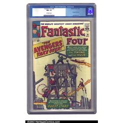 Fantastic Four #26 (Marvel, 1964) CGC NM- 9.2 Off-white pages. Most of the 1963 Marvel Universe appears on this great Jack Kirby cover. This issue finishes the story line begun in the preceding issue, i.e., the first battle between the Hulk and the Thing, and the Avengers crossover. One of the nicest copies of this issue to be graded by CGC to date. Overstreet 2002 NM 9.4 value = $500. Important notice: We expect to be auctioning lots at the rate of 200-250 per hour. Sometimes eBay Premier live bid software cannot keep up with that pace, so we strongly recommend that you place a realistic proxy bid now as insurance to avoid disappointment. Also please note that all Heritage/CAA lots purchased through eBay Premier carry a 20% Buyer's Premium. Please make sure you read the Terms and Conditions.