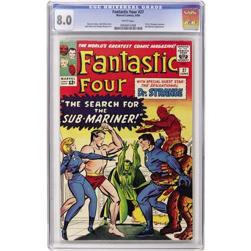 <B>Fantastic Four #27 (Marvel, 1964) CGC VF 8.0 White pages.</B></I> Sub-Mariner appearance. First crossover appearance of Dr. Strange. Jack Kirby cover and art. George Roussos art. Overstreet 2006 VF 8.0 value = $240. CGC census 3/07: 11 in 8.0, 48 higher. <I> From the Janowicz Collection.</B></I><BR><BR><b>Shipping:</b> Comics - Slabbed (certified) (<a target="_blank" href="http://www.heritageauctions.com/common/shipping.php">view shipping information</a>)