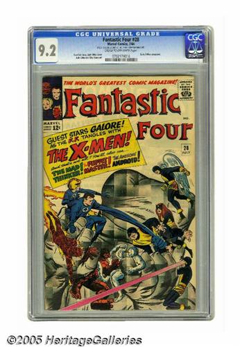 <B>Fantastic Four #28 (Marvel, 1964) CGC NM- 9.2 Cream to off-white pages.</B></I> This was an early crossover for the X-Men, appearing just after #6 of their own book. In the story, the Puppet Master (who's in cahoots with the Mad Thinker) forces Professor X to tell the X-Men to fight the FF! The cover and art are by Jack Kirby. Overstreet 2005 NM- 9.2 value = $750. CGC census 6/05: 9 in 9.2, 12 higher.