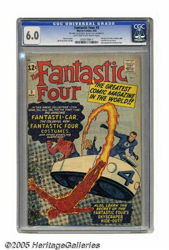 <B>Fantastic Four #3 (Marvel, 1962) CGC FN 6.0 Light tan to off-white pages.</B></I> The Fantastic Four don their costumes for the first time and establish a headquarters in this issue. There's also a brief one-page origin, the introduction of the Fantasti-Car, and the Human Torch drawn with two left hands on the cover by Jack Kirby. Overstreet 2005 FN 6.0 value = $687. CGC census 7/05: 8 in 6.0, 52 higher. <I>From the collection of Joe and Nadia Mannarino.</B></I>