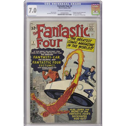 <B>Fantastic Four #3 (Marvel, 1962) CGC FN/VF 7.0 Off-white to white pages.</B></I> Only Stan Lee would dare boast "The Greatest Comic Magazine In The World" after just two issues! And there weren't even any tryouts before the FF got their own title! In this issue they don costumes, show off a Fantasti-Car, and establish a skyscraper headquarters. Miracle Man makes his first appearance. The art is, of course, by Jack Kirby. Overstreet 2006 FN 6.0 value = $723; VF 8.0 value = $2,109. CGC census 9/06: 16 in 7.0, 38 higher.<BR><BR><b>Shipping:</b> Slabbed Comic (<a target="_blank" href="http://www.heritageauctions.com/common/shipping.php">view shipping information</a>)