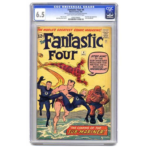 <B>Fantastic Four #4 (Marvel, 1962) CGC FN+ 6.5 Light tan to off-white pages.</B></I> Golden Age hero the Sub-Mariner made his first Silver Age appearance in this issue. And right from the start, he couldn't keep his hands off of the Invisible Girl, as seen on Jack Kirby's cover. Overstreet 2005 FN 6.0 value = $756; VF 8.0 value = $2,205. CGC census 12/05: 10 in 6.5, 57 higher. <I>From the collection of Joe and Nadia Mannarino.</B></I>