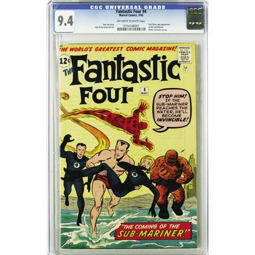 <B>Fantastic Four #4 (Marvel, 1962) CGC NM 9.4 Off-white to white pages.</B></I> Here's a beautiful NM copy of one of the most significant issues of this title's long run, the first Silver Age appearance of the Sub-Mariner! Prince Namor, a star of the Timely comics of the 1940s, hadn't been seen in a comic at all since the mid-1950s, and Jack Kirby's panel sequence that shows the Human Torch "shaving" a derelict's beard to reveal the Sub-Mariner's face is one of the most memorable images of early Marvel comics. In issues to come, Sub-Mariner, now a quasi-villain, would star in many an epic Fantastic Four tale. This is indisputably one of the highlights of our Silver Age selection, and would be an upgrade to most any collector's FF run. Overstreet 2006 NM- 9.2 value = $5,800. CGC census 4/06: 6 in 9.4, 1 higher.