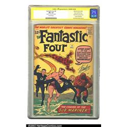 Fantastic Four #4 Stan Lee File Copy (Marvel, 1962) CGC FN- 5.5 Off-white pages. Signature Series. One of the most important books of the early Silver Age, this was the introduction of Namor the Sub-Mariner into the modern Marvel Universe. A true key no matter how you slice it, this book is made infinitely more desirable by its inclusion in the legendary Stan Lee File Copy collection. Stan's personal copy of this immortal issue, "The Man" has signed the book boldly across the cover in blue marker. Overstreet 2002 FN 6.0 value = $645. Important notice: We expect to be auctioning lots at the rate of 200-250 per hour. Sometimes eBay Premier live bid software cannot keep up with that pace, so we strongly recommend that you place a realistic proxy bid now as insurance to avoid disappointment. Also please note that all Heritage/CAA lots purchased through eBay Premier carry a 20% Buyer's Premium. Please make sure you read the Terms and Conditions.