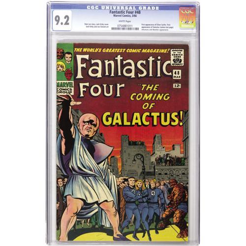 No true-blue Marvel front-facer should be without this one, the issue with the first appearances of the Silver Surfer and Galactus. Jack Kirby's vibrant visuals and Stan Lee's thesaurus-thrashing prose combined for a real classic. Note the perfect page quality! Overstreet 2006 NM- 9.2 value = $1,000. CGC census 12/06: 65 in 9.2, 121 higher.<BR><BR><b>Shipping:</b> Slabbed Comic (<a target="_blank" href="http://www.heritageauctions.com/common/shipping.php">view shipping information</a>)