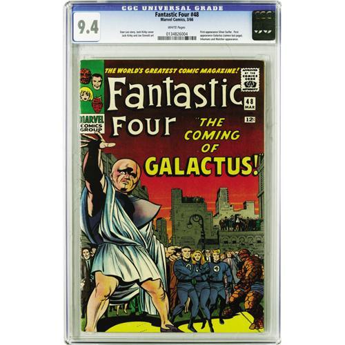 <B>Fantastic Four #48 (Marvel, 1966) CGC NM 9.4 White pages.</B></I> This epic issue marked the moment when Marvel's star creators Stan Lee and Jack Kirby "took it to the next level" as they say in sports. It's the first appearance of the Silver Surfer as well as that of Galactus, and the Inhumans and the Watcher are also on hand for the senses-shattering affair. For your <B>Fantastic Four</B></I> run to be taken seriously, a top-flight copy of this issue is a must! Overstreet 2006 NM- 9.2 value = $1,000. CGC census 3/06: 59 in 9.4, 53 higher.