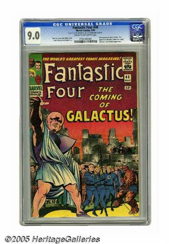 <B>Fantastic Four #48 (Marvel, 1966) CGC VF/NM 9.0 Cream to off-white pages.</B></I> This epic issue, the first installment of a three-part story, has the first appearances of the Silver Surfer and Galactus. The Inhumans and the Watcher also appear. It's all drawn as only Jack Kirby can. Overstreet 2005 VF/NM 9.0 value = $726; NM- 9.2 value = $1,000. CGC census 6/05: 55 in 9.0, 164 higher. <I>From the collection of Joe and Nadia Mannarino.</B></I>
