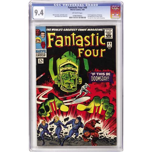 <B>Fantastic Four #49 (Marvel, 1966) CGC NM 9.4 Off-white pages.</B></I> Both the Silver Surfer and Galactus appeared on a cover for the first time here (both made their second appearance overall). If you say you don't remember <I>this</B></I> epic storyline, we don't believe ya! Jack Kirby drew it, as only Kirby could. Overstreet 2006 NM- 9.2 value = $600. CGC census 3/07: 8 in 9.4, 6 higher.<BR><BR><b>Shipping:</b> Comics - Slabbed (certified) (<a target="_blank" href="http://www.heritageauctions.com/common/shipping.php">view shipping information</a>)