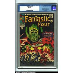 Fantastic Four #49 (Marvel, 1966) CGC NM+ 9.6 Off-white pages. Silver Surfer and Galactus get their first cover feature on this issue. It is also the second appearance for both. To find a copy like this is a real miracle. This book is particularly difficult to find in any grade above Fine because of the dark nature of the cover, but in this grade it is basically impossible. According to the latest update to the CGC census, they have not graded any copies of this book higher, meaning that you will be really getting the best of the best with this one. Overstreet 2002 NM 9.4 value = $340. Important notice: We expect to be auctioning lots at the rate of 200-250 per hour. Sometimes eBay Premier live bid software cannot keep up with that pace, so we strongly recommend that you place a realistic proxy bid now as insurance to avoid disappointment. Also please note that all Heritage/CAA lots purchased through eBay Premier carry a 20% Buyer's Premium.