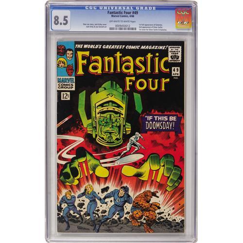 <B>Fantastic Four #49 (Marvel, 1966) CGC VF+ 8.5 Off-white to white pages.</B></I> Here's part two of an epic three-part storyline, featuring the second appearances of the Silver Surfer and Galactus. It's also the first cover appearance for both characters. Jack Kirby does cover art duties, and is assisted by Joe Sinnott for the story art. Overstreet 2006 VF 8.0 value = $425; VF/NM 9.0 value = $713. CGC census 3/07: 28 in 8.5, 59 higher. <I> From the Janowicz Collection.</B></I><BR><BR><b>Shipping:</b> Comics - Slabbed (certified) (<a target="_blank" href="http://www.heritageauctions.com/common/shipping.php">view shipping information</a>)