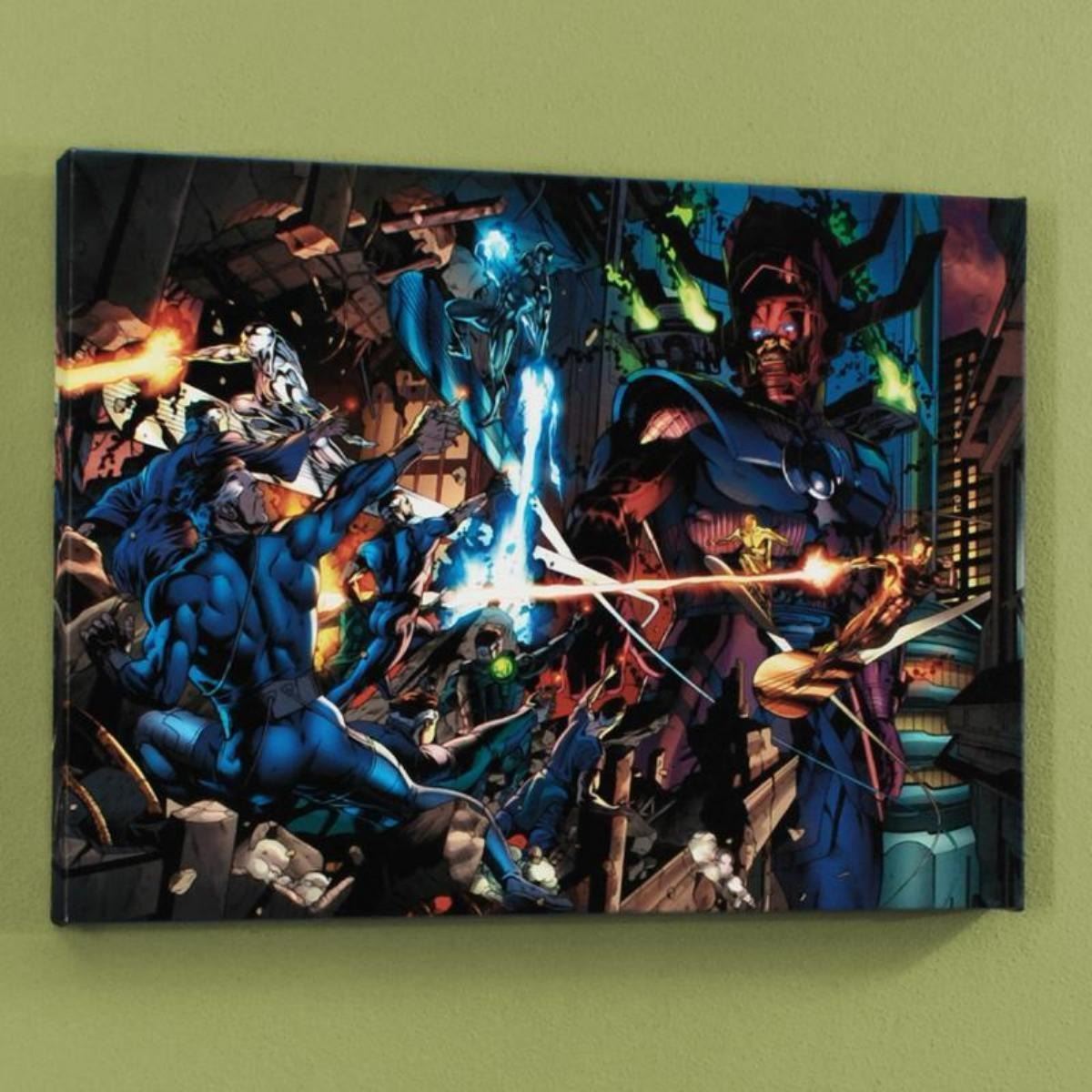 A piece of comic book history, this limited edition, from original art by Dale Eaglesham, depicts an action packed scene featuring the Fantastic Four. Dale Eaglesham is known for his work on titles like Conan, Punisher, Green Lantern, Villains United, Justice Society of America and Fantastic Four. In 2008, he won the Joe Shuster Award for Outstanding Canadian Comic Book Artist. "Fantastic Four #571" is a limited edition giclee on canvas by Dale Eaglesham presented by Marvel Comics! This piece comes gallery wrapped. Includes Certificate of Authenticity! Measures approx. 24" x 18" (image); 1.5" (depth).