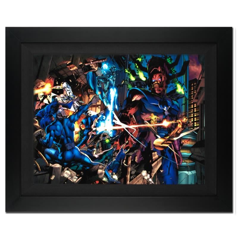 A piece of comic book history, this limited edition, from original art by Dale Eaglesham, depicts an action packed scene featuring the Fantastic Four. Dale Eaglesham is known for his work on titles like Conan, Punisher, Green Lantern, Villains United, Justice Society of America and Fantastic Four. In 2008, he won the Joe Shuster Award for Outstanding Canadian Comic Book Artist. "Fantastic Four #571" is an extremely limited edition giclee on canvas by Dale Eaglesham presented by Marvel Comics, hand signed by the great Stan Lee and numbered out of only 10! This piece comes custom framed and is ready to hang. Includes Certificate of Authenticity! Measures approx. 31" x 25" (with frame), 24" x 18" (image).