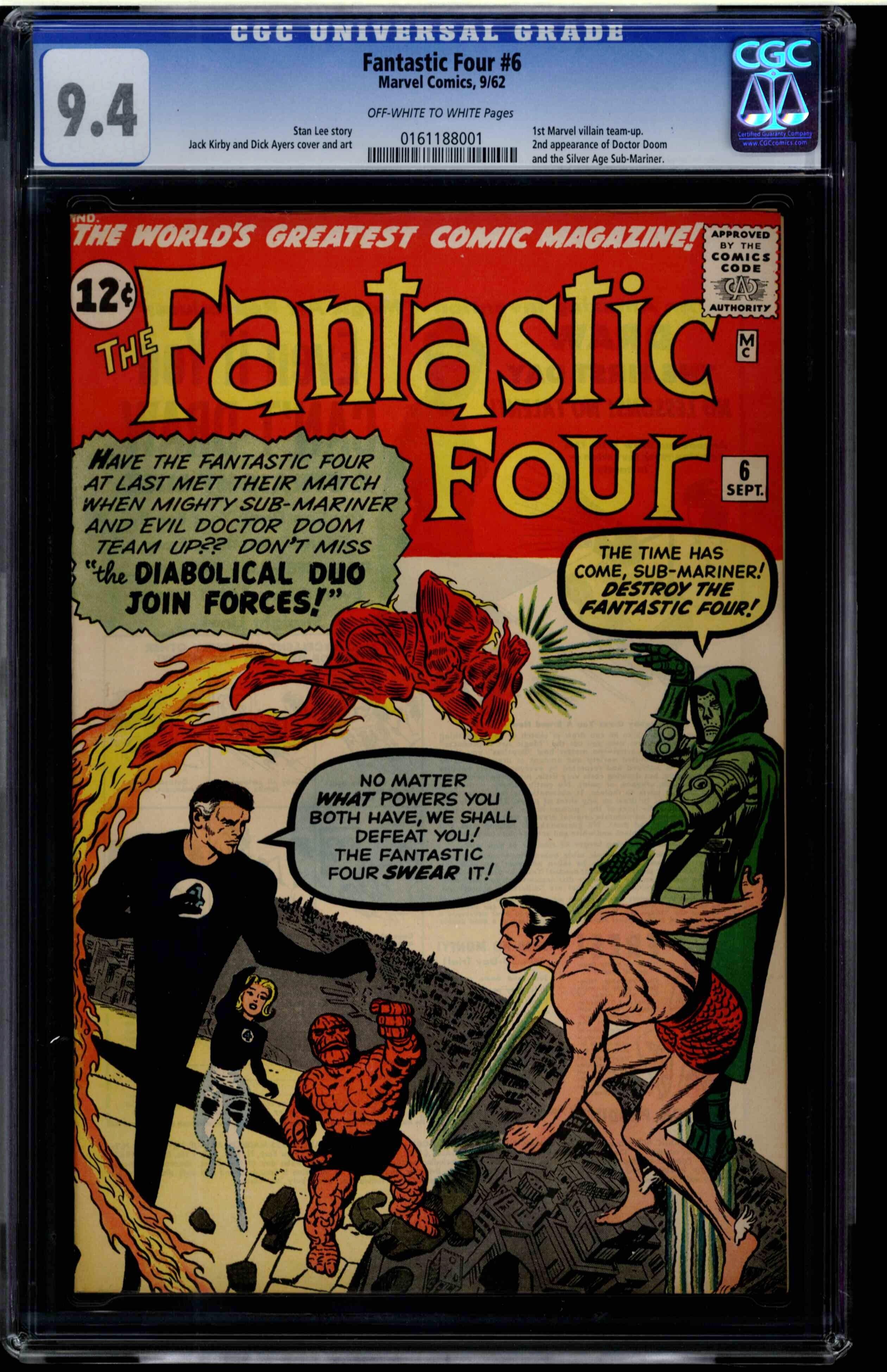 Fantastic Four #6 CGC 9.4 off-white to white pages. Stan Lee story, Jack Kirby and Dick Ayers cover and art. 1st Marvel villain team-up. 2nd appearance of Dr. Doom and the Silver Age Sub-Mariner. Overstreet 2009 NM 9.2 value = $4,200. The CGC universal census reports 2 at 9.4, 1 higher.