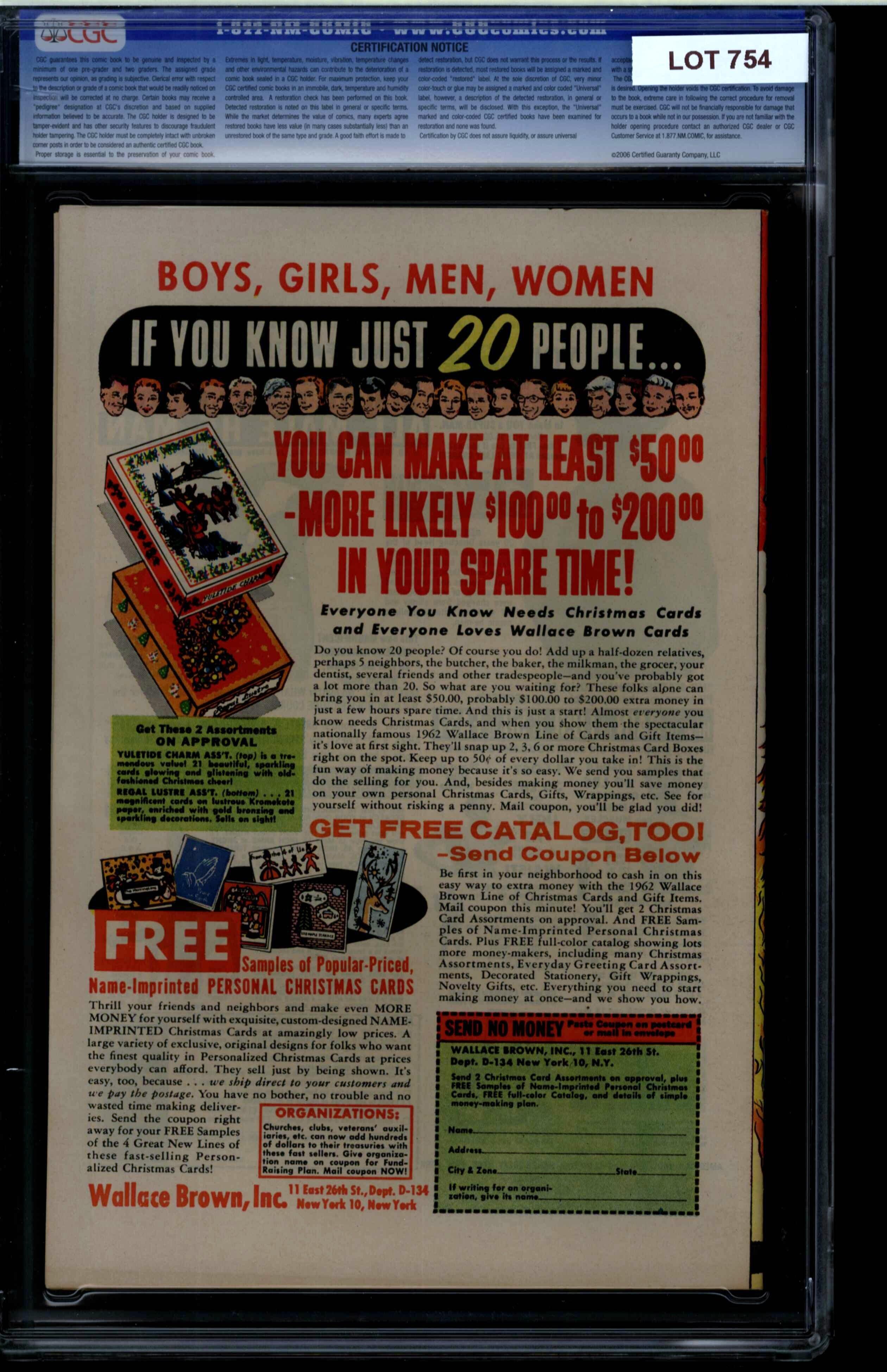 The Auctioneer has reserved the right to reject any and all bids, and to bid at the auction. Auctioneers Auctions are not on approval. Auctioneer does not allow certified material to be returned because of possible differences of opinion with respect to the grade offered by any third party organization, dealer, or service. Absolutely no guarantee of grade is offered for un-certified property sold and subsequently submitted to a third-party grading service. There will be no exceptions to this policy. Under extremely limited circumstances, (e.g. gross cataloging error) a purchaser, who did not bid from the floor, may request Auctioneer to evaluate voiding a sale; such request must be made in writing detailing the alleged gross error, and submission of the lot to the Auctioneer must be pre-approved by the Auctioneer. Bidder must notify Auctioneer in writing of such request within three (3) days of the non-floor bidder receipt of the lot. Any lot that is to be evaluated must be in our offices within 30 days after Auction. Grading does not qualify for this evaluation process nor do such complaints constitute a basis to challenge the authenticity of a lot. AFTER THAT 30-DAY PERIOD, NO LOTS MAY BE RETURNED FOR REASONS OTHER THAN AUTHENTICITY. Lots returned must be housed intact in the original holder. No lots purchased by floor Bidders may be returned (including those Bidders acting as agents for others). Late remittance for purchases may be considered just cause to revoke all return privileges. B: Auctions conducted solely on the Internet have a THREE (3) DAY RETURN POLICY: Lots paid for within seven days of the Auction closing are sold with a three (3) day return privilege. You may return lots under the following conditions: Within three days of receipt of the lot, you must first notify Auctioneer by contacting Client Service by phone (314-680-8599) or e-mail (moundcityauctions@gmail.com), and immediately mail the lot(s) fully insured to the attention of Returns, Mound City Auctions 1081 Teson Rd. Hazelwood, MO. 63042. Lots must be housed intact in their original holder and in their original condition. You are responsible for the insured, safe delivery of any lots. Auctioneer will not be responsible for lots returned in non-registered mail or lots returned without prior authorization per section B. A non-negotiable return fee of 5% of the purchase price ($10 per lot minimum) will be deducted from the refund for each returned lot or billed directly. Postage and handling fees are not refunded. After the three-day period (from receipt), no items may be returned for any reason. Late remittance for purchases revokes all Return-Restock privileges. C: Bidders who have inspected the lots prior to the auction will not be granted any return privileges. D: Comic books sold referencing a third-party grading service are sold “as is” without any express or implied warranty. Certain warranties may be available from the grading services and the Bidder is referred to them for further details: Certified Guaranty Company, LLC. (CGC), P.O. Box 4738, Sarasota, FL 34230. E: Bidders who intend to challenge authenticity or provenance of a lot must notify Auctioneer in writing within thirty (30) days of the Auctions conclusion. In the event Auctioneer cannot deliver the lot or subsequently it is established that the lot lacks title, provenance, authenticity, or other transfer or condition issue is claimed, Auctioneer's liability shall be limited to rescission of sale and refund of purchase price; in no case shall Auctioneer's maximum liability exceed the high bid on that lot, which bid shall be deemed for all purposes the value of the lot. After one year has elapsed, Auctioneer's maximum liability shall be limited to any commissions and fees Auctioneer earned on that lot. F: All comics are guaranteed genuine, but are not guaranteed as to grade, since grading is a matter of opinion, an art and not a science, and therefore the opinion rendered by the Auctioneer or any third party grading service may not agree with the opinion of others (including trained experts), and the same expert may not grade the same item with the same grade at two different times. G: Since we cannot examine encapsulated comics, they are sold “as is”without our grading opinion, and may not be returned for any reason. Auctioneer shall not be liable for any patent or latent defect or controversy pertaining to or arising from any encapsulated collectible. In any such instance, purchaser's remedy, if any, shall be solely against the service certifying the collectible. H: Due to changing grading standards over time, differing interpretations, and to possible mishandling of items by subsequent owners, Auctioneer reserves the right to grade items differently than shown on certificates from any grading service that accompany the items. Auctioneer also reserves the right to grade items differently than the grades shown in the prior catalog should such items be reconsigned to any future auction. I: Although consensus grading is employed by most grading services, it should be noted as aforesaid that grading is not an exact science. In fact, it is entirely possible that if a lot is broken out of a plastic holder and resubmitted to another grading service or even to the same service, the lot could come back with a different grade assigned. J: Certification does not guarantee protection against the normal risks associated with potentially volatile markets. The degree of liquidity for certified collectibles will vary according to general market conditions and the particular lot involved. For some lots there may be no active market at all at certain points in time."