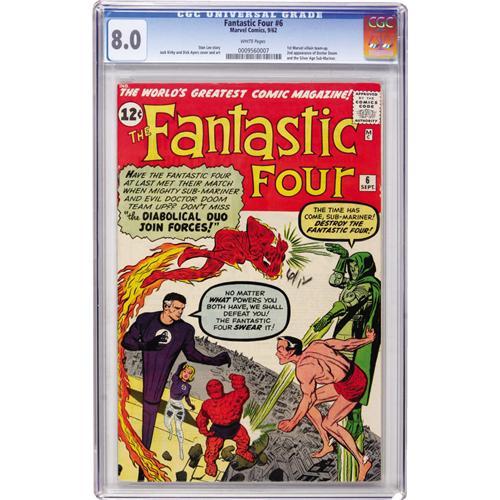 <B>Fantastic Four #6 (Marvel, 1962) CGC VF 8.0 White pages.</B></I> In Marvel's first-ever supervillain team-up, it's Dr. Doom joining the Sub-Mariner in the second appearance of both (second <I>Silver Age</B></I> appearance in Subby's case, natch)! Jack Kirby drew the entire issue. Overstreet 2006 VF 8.0 value = $1,310. CGC census 3/07: 13 in 8.0, 28 higher. <I> From the Janowicz Collection.</B></I><BR><BR><b>Shipping:</b> Comics - Slabbed (certified) (<a target="_blank" href="http://www.heritageauctions.com/common/shipping.php">view shipping information</a>)
