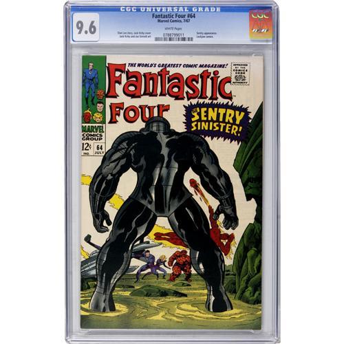 <B>Fantastic Four #64 (Marvel, 1967) CGC NM+ 9.6 White pages.</B></I> This is the nicest copy we've seen of this book! The Kree are such regulars in the Marvel Universe, it's surprising that they got their first-ever mention in this very issue (62 issues later than their foes the Skrulls), and it's because a Kree Sentry is discovered here. He's a formidable foe for the FF. Jack Kirby drew the entire issue. Overstreet 2006 NM- 9.2 value = $85. CGC census 3/07: 8 in 9.6, 1 higher.<BR><BR><b>Shipping:</b> Comics - Slabbed (certified) (<a target="_blank" href="http://www.heritageauctions.com/common/shipping.php">view shipping information</a>)