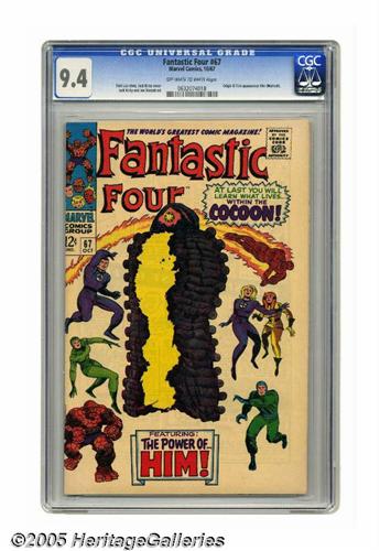 <B>Fantastic Four #67 (Marvel, 1967) CGC NM 9.4 Off-white to white pages.</B></I> This issue had the first appearance of Him, who later became known as Adam Warlock and starred in more than one series of his own in years to come. The cover and art are by Jack Kirby. Overstreet 2005 NM- 9.2 value = $185. CGC census 4/05: 13 in 9.4, 6 higher.