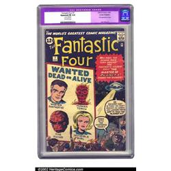 Fantastic Four #7 (Marvel, 1962) CGC Apparent FN 6.0 Off-white pages. Restoration: cover trimmed. Why does the human race turn against the Fantastic Four? Only "The Master of Planet X" knows the answer! And so the fabled FF take off in a flying saucer in Jack Kirby's classic "Wanted Dead or Alive" cover. Displaying moderate wear, and a minor cover trim earning the book a purple label, this is still a very nice copy that would be a bargain for the FF collector of modest means who wants to fill in the early issues in the run. Overstreet 2002 GD 2.0 value = $72; FN 6.0 value = $216. Important notice: We expect to be auctioning lots at the rate of 200-250 per hour. Sometimes eBay Premier live bid software cannot keep up with that pace, so we strongly recommend that you place a realistic proxy bid now as insurance to avoid disappointment. Also please note that all Heritage/CAA lots purchased through eBay Premier carry a 20% Buyer's Premium. Please make sure you read the Terms and Conditions.