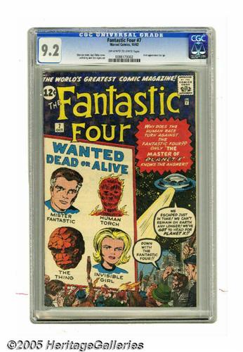 <B>Fantastic Four #7 (Marvel, 1962) CGC NM- 9.2 Off-white to white pages.</B></I> The Fantastic Four, fleeing Earth? This was the first science fiction-type cover for this title, and it's in the unmistakable style of Jack Kirby (nobody could draw angry mobs like the King!). Inside the book is more Kirby art, as well as the first (and last) appearance of Kurrgo, Master of Planet X. Note that this issue's grade is just one notch below the highest (9.4) that CGC has assigned to date. Overstreet 2005 NM- 9.2 value = $1,950. CGC census 2/05: 7 in 9.2, 2 higher.
