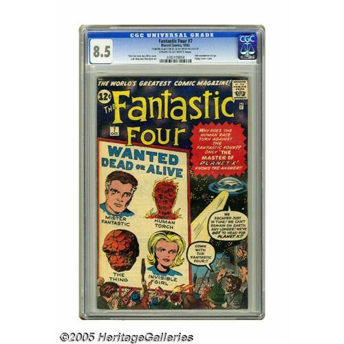 <B>Fantastic Four #7 (Marvel, 1962) CGC VF+ 8.5 Cream to off-white pages.</B></I> This cover has the feel of one of those Atlas monster or mystery mags, but why shouldn't it, with Jack Kirby drawing it and Stan Lee providing the words? In this Stan-and-Jack tale, the fate of a planet hangs in the balance. Overstreet 2005 VF 8.0 value = $876; VF/NM 9.0 value = $1,413. CGC census 7/05: 9 in 8.5, 14 higher. <I>From the collection of Joe and Nadia Mannarino.</B></I> <BR><BR><B>Important notice:</B> Heritage usually auctions material at the rate of 200-250 lots per hour. On some occasions eBay Live bid software or the Internet may not be able to keep up with the pace of the auction. We recommend placing a realistic absentee bid now as insurance to avoid disappointment. Occasionally the auctioneer may eliminate or reject an eBay Live bid, and the auctioneer may also reopen a lot after the close of the eBay live bidding (usually because we missed an audience bid), and may reject your bid even if it shows you as the winning bidder. By bidding via eBay Live, you agree that Heritage may award the lot to another bidder at its sole discretion under the circumstances described above or any other reasonable circumstances. Since eBay bids are not shown to us until we open the lot on the floor, we treat those bids just like floor bids. In most cases the floor responds before the eBay bid is presented to us, due to Internet lag time, so for consistency we have made it a policy that floor bids are always considered first over tie eBay live bids. Also please note that all Heritage lots purchased through eBay Live carry a 20% Buyer's Premium. Please make sure you read the Terms and Conditions before you bid. This lot is being auctioned in conjunction with a live floor auction by Heritage Galleries & Auctioneers. All final auction and invoice information will be supplied by Heritage Galleries & Auctioneers, and all other information should be considered preliminary. Lot:1066 <BR><BR><B>
