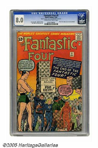 <B>Fantastic Four #9 (Marvel, 1962) CGC VF 8.0 Cream to off-white pages.</B></I> The Fantastic Four: bankrupt! That's the scenario after Reed Richards' investments go sour (gosh, Enron sounded so good...). To make things worse, they fall prey to a trap by the Sub-Mariner, who makes his third Silver Age appearance in this issue. As if that weren't enough excitement, Bob Hope, Bing Crosby, and Alfred Hitchcock make one-panel cameo appearances. Overstreet 2005 VF 8.0 value = $876. CGC census 7/05: 3 in 8.0, 21 higher. <I>From the collection of Joe and Nadia Mannarino.</B></I>