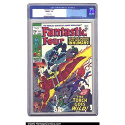 Fantastic Four #99 (Marvel, 1970) CGC NM/MT 9.8 Off-white pages. This is the highest CGC-graded copy. What an exciting cover by Jack Kirby! Compositionally, the image is full of dynamic elements that keep the eye moving continually across the surface. This very clean near-pristine copy may never be improved upon. Overstreet 2002 NM 9.4 value = $35. Important notice: We expect to be auctioning lots at the rate of 200-250 per hour. Sometimes eBay Premier live bid software cannot keep up with that pace, so we strongly recommend that you place a realistic proxy bid now as insurance to avoid disappointment. Also please note that all Heritage/CAA lots purchased through eBay Premier carry a 20% Buyer's Premium. Please make sure you read the Terms and Conditions.